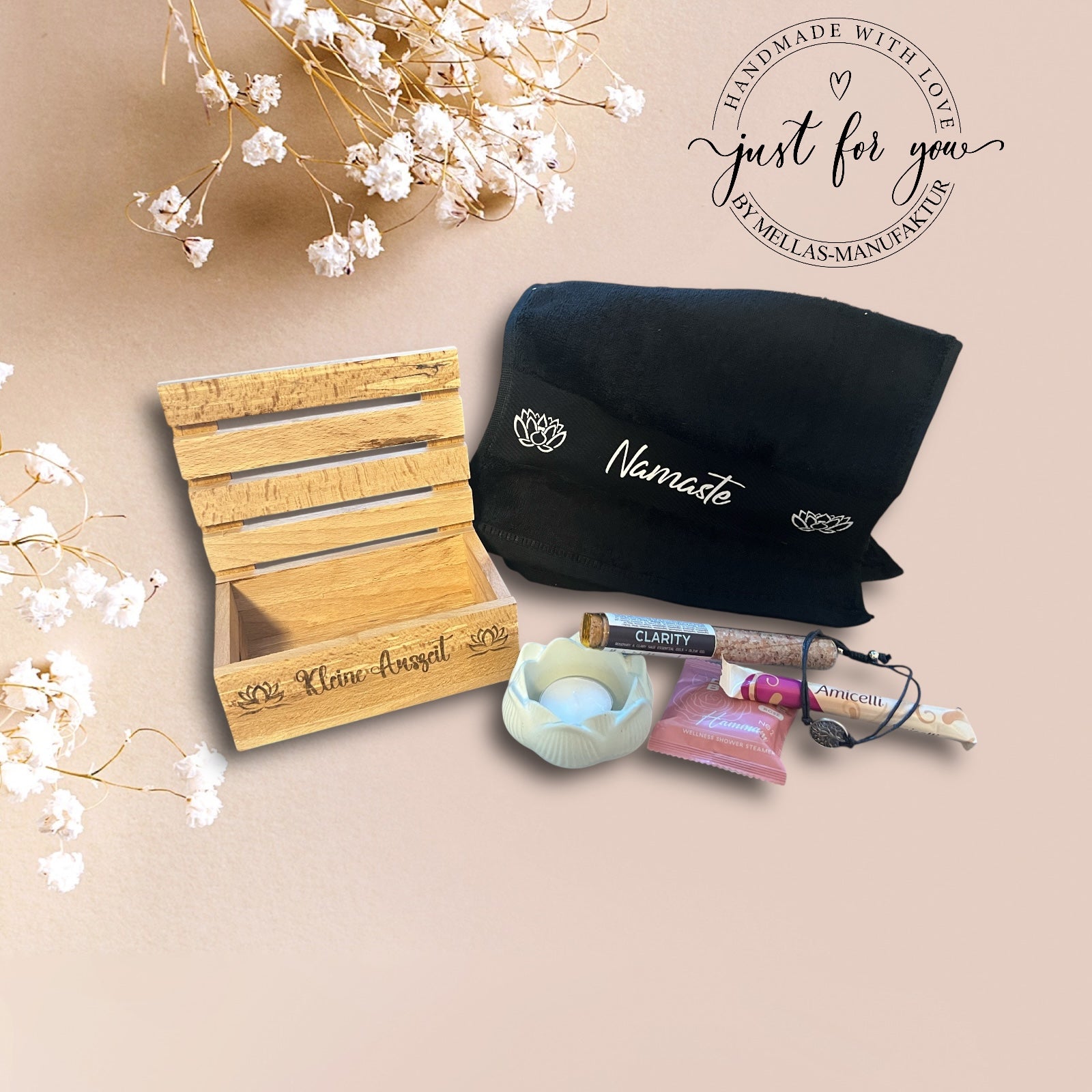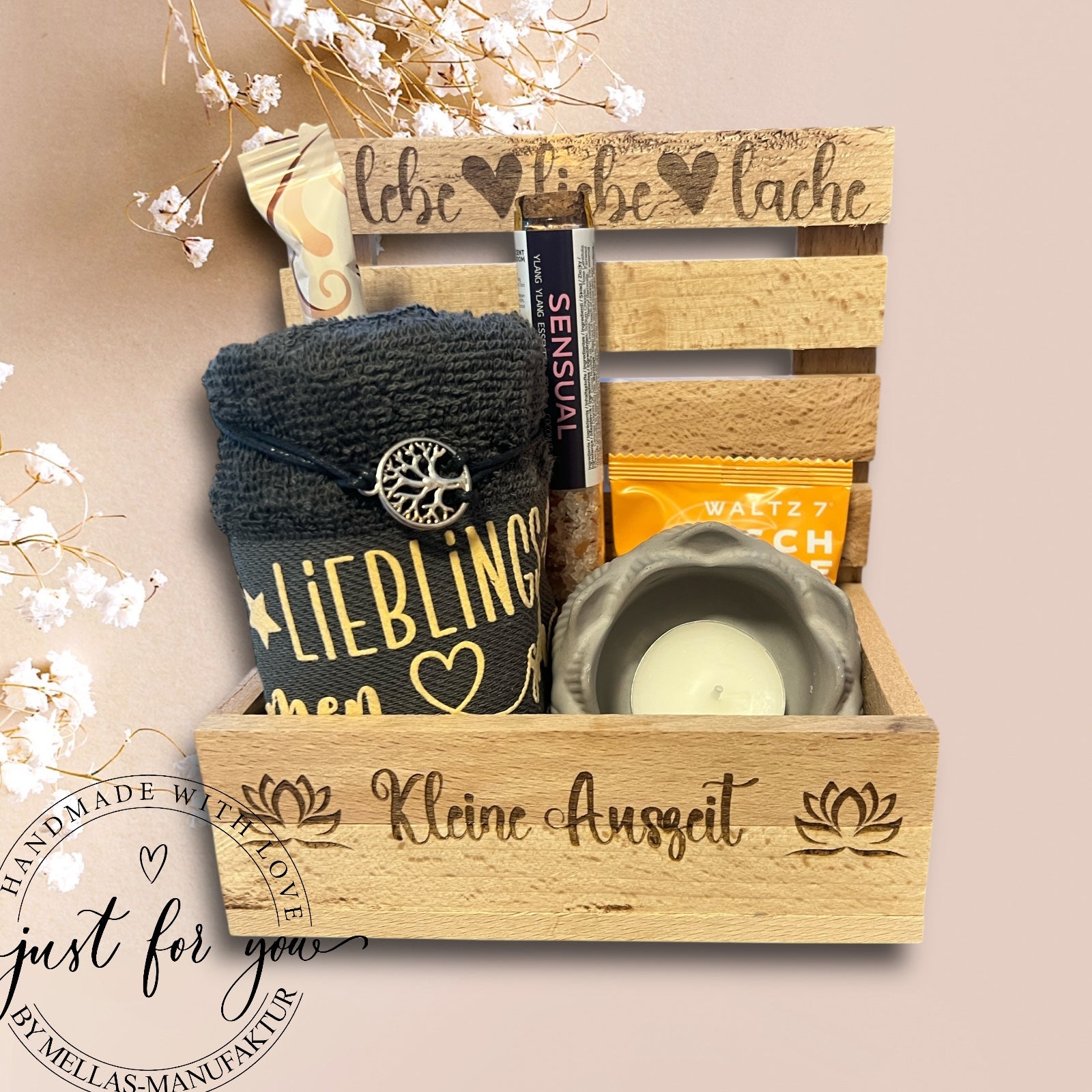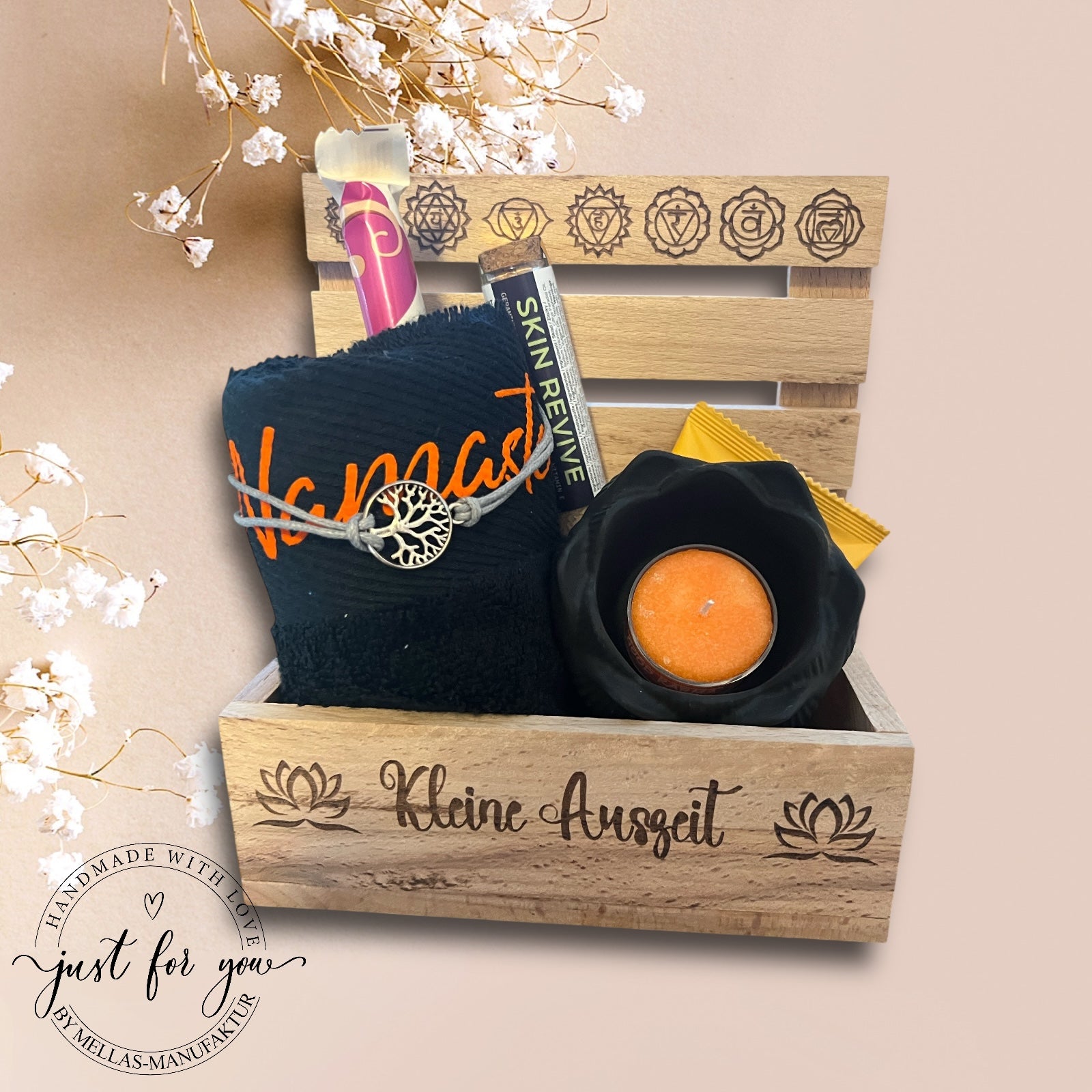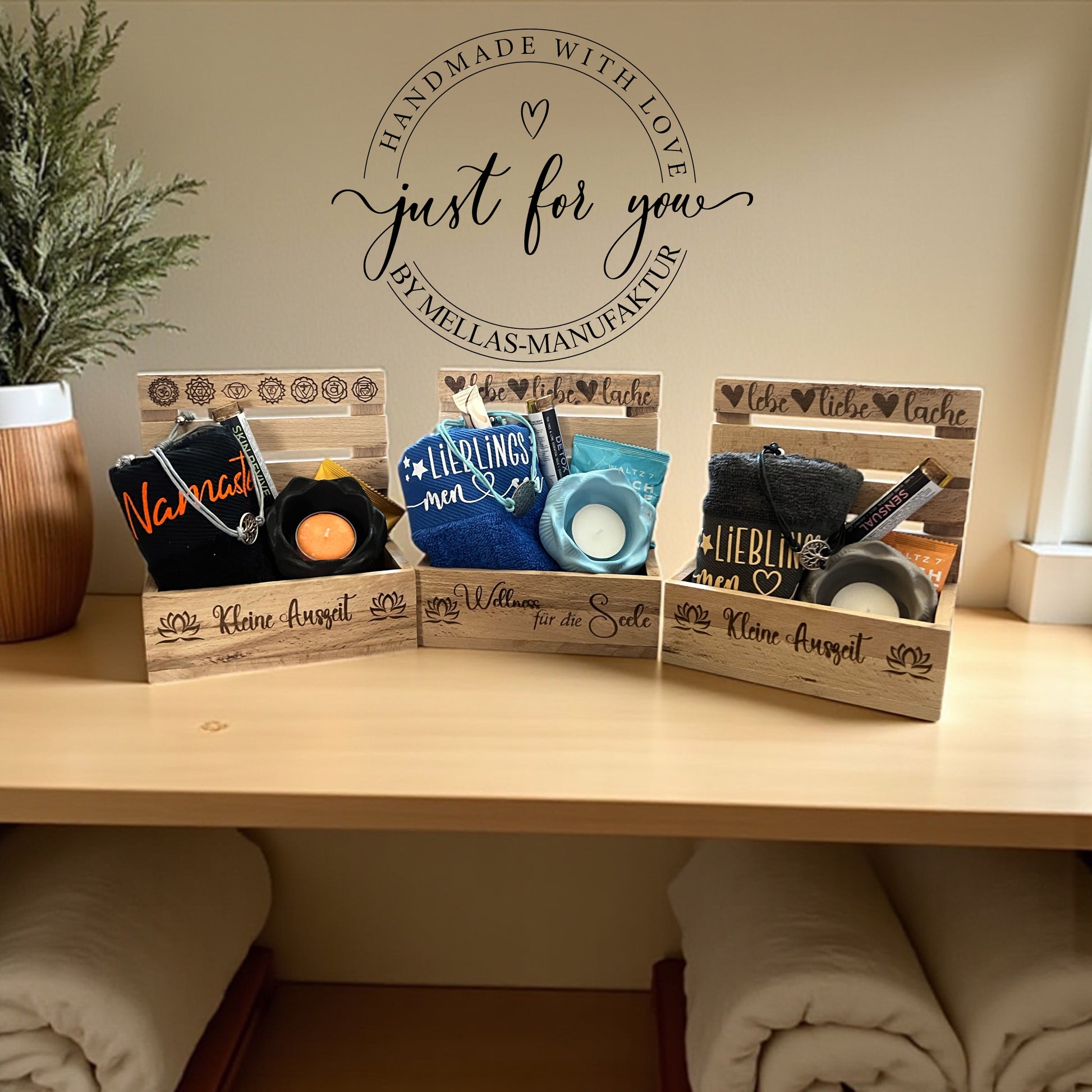 Ein liebevoll gestaltetes Körbchen aus Bastelklötzchen mit edler Gravur – wahlweise „Kleine Auszeit“ oder „Wellness für die Seele“.