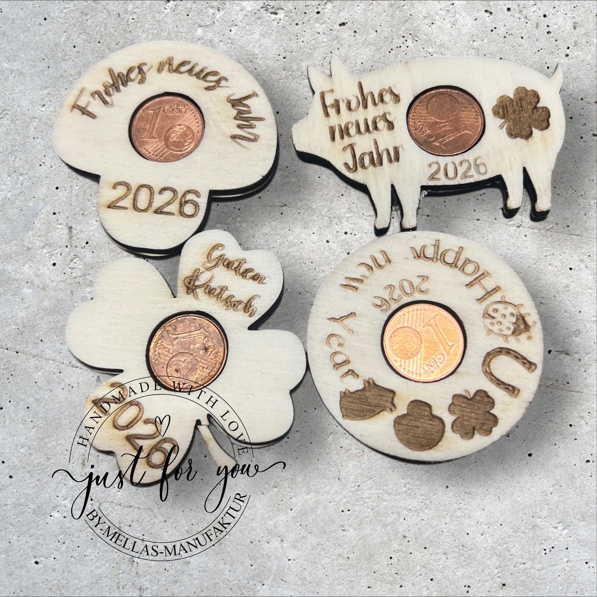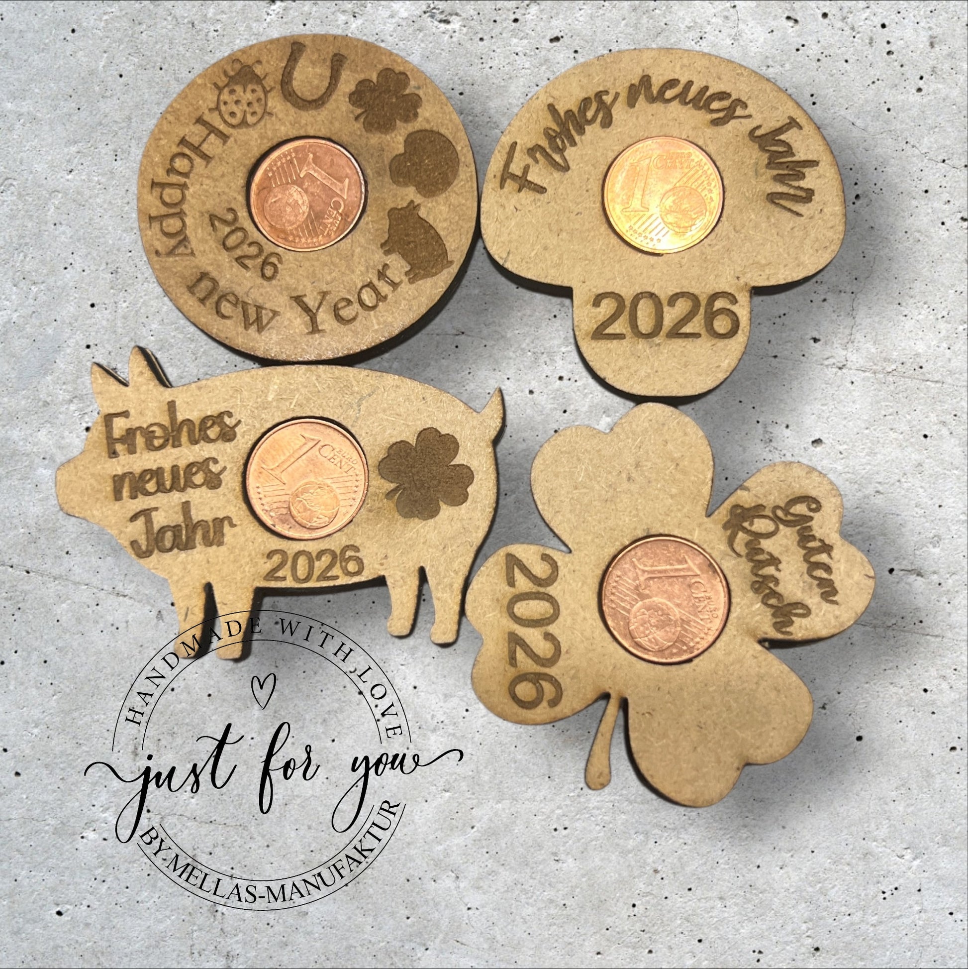 Mit dieser Laserdatei für Silvester-Glücksbringer kannst du die beliebten kleinen Holz-Glücksbringer mit echter 1-Cent-Münze ganz einfach selbst herstellen!